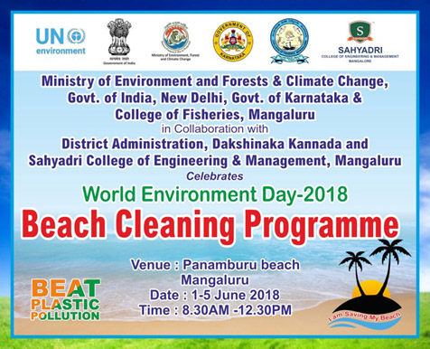The Ministry of Environment, Forest, Ecology & Climate change has planned to undertake cleaning of beaches and river stretches in the country. World Environment DAY Programme from 01.06.2018 to 05.06.2018 in Panambur and Malpe Beach of Dakshina Kannada and Udupi district are organizing the event in association with Ministry of Environment, Forest, Ecology & Climate change, Govt. of Karnataka, District Administration, Dakshina Kannada & Udupi, Fisheries College and Sahyadri College of Engineering & Management, Mangaluru.