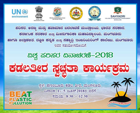 The Ministry of Environment, Forest, Ecology & Climate change has planned to undertake cleaning of beaches and river stretches in the country. World Environment DAY Programme from 01.06.2018 to 05.06.2018 in Panambur and Malpe Beach of Dakshina Kannada and Udupi district are organizing the event in association with Ministry of Environment, Forest, Ecology & Climate change, Govt. of Karnataka, District Administration, Dakshina Kannada & Udupi, Fisheries College and Sahyadri College of Engineering & Management, Mangaluru.