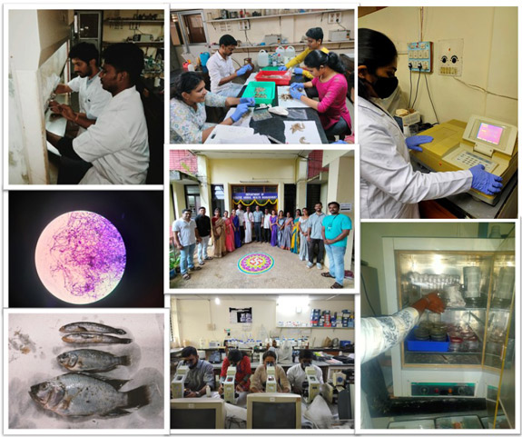 Till date, Dept of Aquatic Animal Health Management (previously Department of Fisheries Microbiology) has handled more than 30 research projects with a budget of more than 25 crores and developed 2 patents. The Department offers undergraduate and postgraduate courses and is specialized in Fundamentals of Microbiology, Fish and Shellfish Pathology, Fish and Shellfish Immunology, Therapeutics in Aquaculture, Pharmacology Fish Toxicology, Microbial & Parasitic Diseases of Fish and Shellfish.