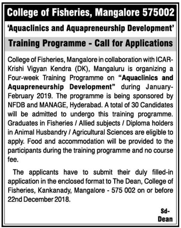 Advertisement - ‘Aquaclinics and Aquapreneurship Development’ Training Programme